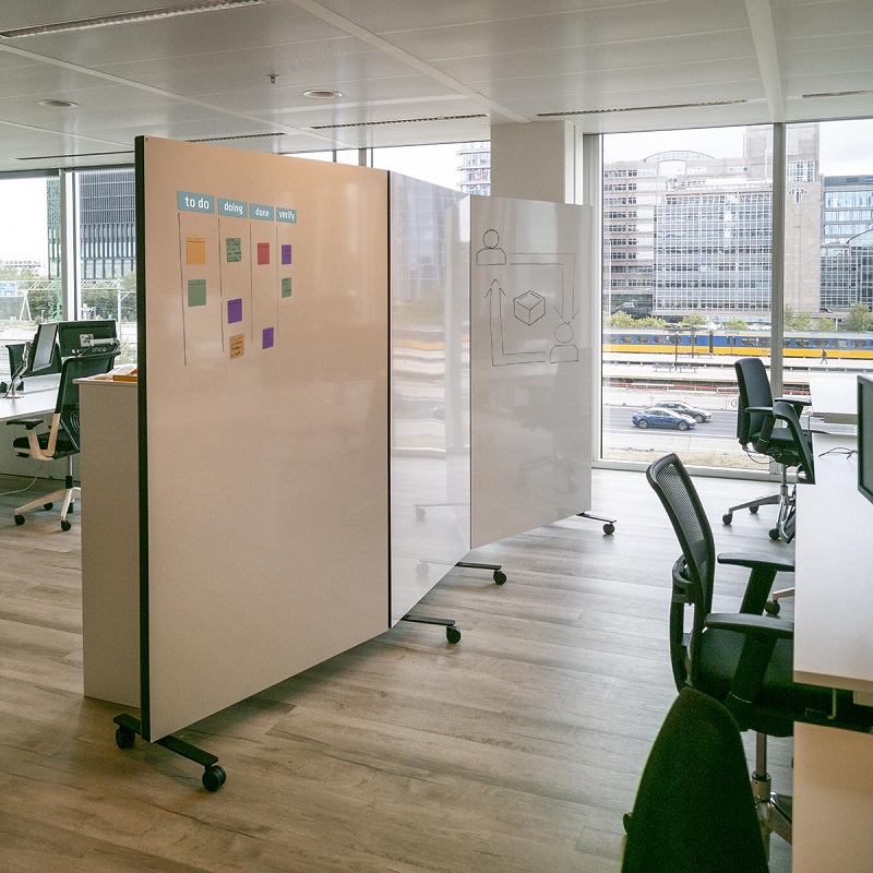 “Als überzeugter und motivierter Agile Leader liegt das ‘Was’ und ‘Warum’ bei Ihnen und das ‘Wie’ bei den Teammitgliedern, die die eigentlichen Spezialisten sind. Der Agile-Coach sorgt dafür, dass diese neue Arbeitsweise gut anläuft und reibungslos weiterläuft. Agile bietet den Rahmen dafür und funktioniert am besten, wenn man zusammen ist. Eine einladende, inspirierende Büroeinrichtung ist daher von entscheidender Bedeutung, ebenso wie verschiedene Werkzeuge, mit denen Sie Ihre Ideen, Pläne und Fortschritte visualisieren können. Wände und Whiteboards sind daher unverzichtbar. Der größte Fehler, der bei der Wahl des Büros noch zu oft gemacht wird, ist, dass zu wenig Fläche angemietet oder genutzt wird, unter anderem für den geräumigen Obeya-Saal und für verschiedene Besprechungsräume unterschiedlicher Größe, einschließlich eines Besprechungsbereichs für effektive Stehsitzungen. Diese Meter werden wegen der interaktiven Arbeitsformen benötigt. Mit Agile bewegen Sie sich buchstäblich im Raum, was die Kommunikation zwischen Ihnen erheblich verbessert. Denken Sie nur daran, wie Sie Ihre Argumente mit Ihrer Körpersprache untermauern. Auch das Kaffeekränzchen als Treffpunkt ist nicht zu unterschätzen, denn viele Entscheidungen werden in einer entspannten Atmosphäre getroffen. Meiner Meinung nach wird die Funktion des Büros für alle, die agil arbeiten, nur noch wichtiger werden. Für die kommende Zeit erwarte ich eine gesunde Mischung aus Heimarbeit und Büroarbeit. Einige Sitzungen, wie z. B. die Besprechung praktischer Fragen unter vier Augen, lassen sich gut online durchführen. Sitzungen, bei denen es um Interaktion, Reflexion und Bewusstseinsbildung geht, können nur im Büro stattfinden, da sie eine wirkliche Vertiefung der gegenseitigen Beziehungen erfordern. Das ist online nicht machbar.”