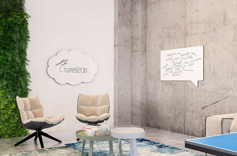 Chameleon Speech & Thoughts are supplied including a very easy, TÜV certified mounting system. Mounting is done by means of magnetic plates of 30×30 cm, which you screw onto the wall according to the drawing. The whiteboard panel can then be hung firmly on the wall via magnetism and easily aligned. The wall must be straight and even for this.