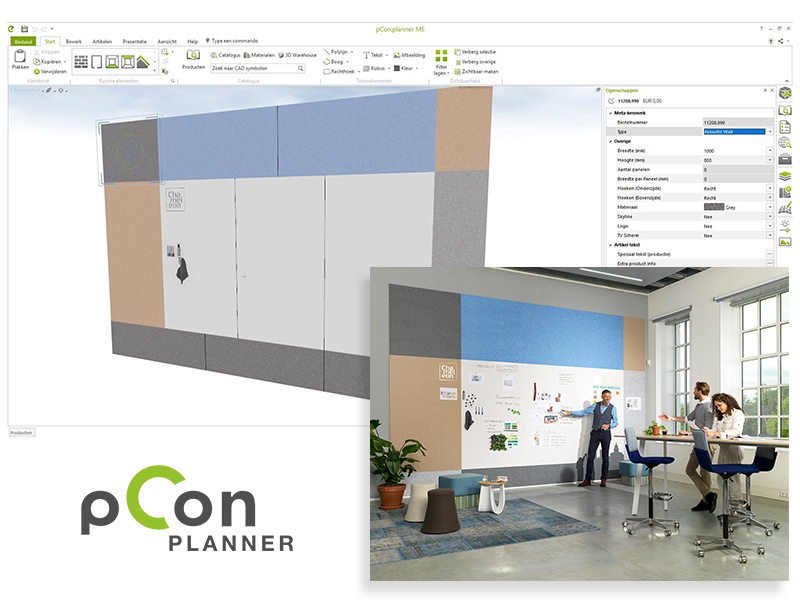 Le pCon.planner, mondialement connu, est un logiciel d’aménagement intérieur en 3D pour ordinateurs portables et ordinateurs de bureau utilisé par d’innombrables professionnels de l’aménagement intérieur. Les données de Chameleon sont uniques : un configurateur personnalisé vous permet de personnaliser entièrement un tableau blanc. Déterminez les dimensions, les matériaux, les couleurs et même les découpes pour donner à votre projet une configuration de tableau blanc unique.