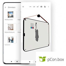 pCon.box est un outil pratique pour configurer les tableaux blancs Chameleon et les placer directement dans une pièce via la réalité augmentée. Il est également possible, par exemple, de télécharger un plan d’étage en 2D et de placer nos tableaux blancs à la bonne taille.