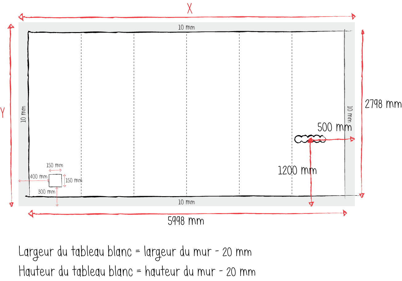 Les dimensions restantes correspondent à la taille du mur d’écriture du sol au plafond que vous commanderez ou installerez. Ainsi, vous êtes sûr que tout s’adaptera avec précision et harmonie.