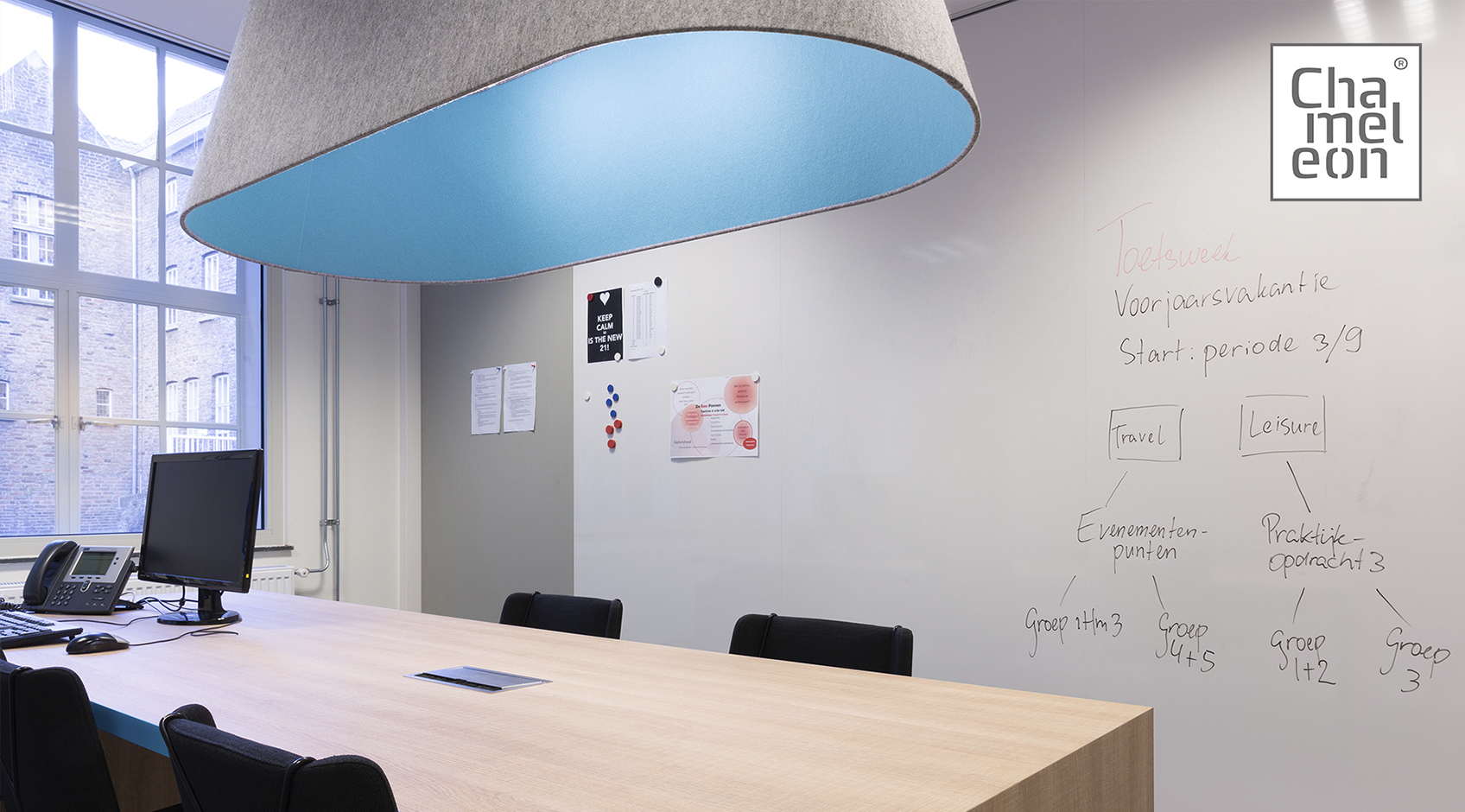 Plusieurs configurations de murs de tableau blanc en combinaison avec la surface du tableau d’affichage. La surface du tableau blanc est entièrement émaillée et est réalisée sur mesure pour remplir entièrement le mur.
