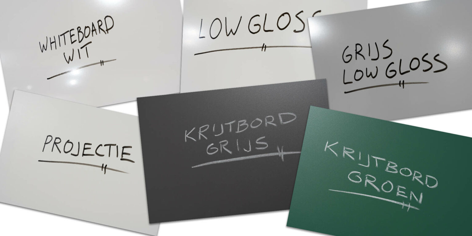 De keuze tussen whiteboard Wit, Low Gloss, Projectie, Krijtbord Grijs en Krijtbord Groen hangt af van je specifieke behoeften en de omgeving waarin je het bord wilt gebruiken.