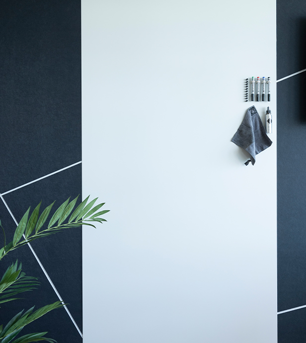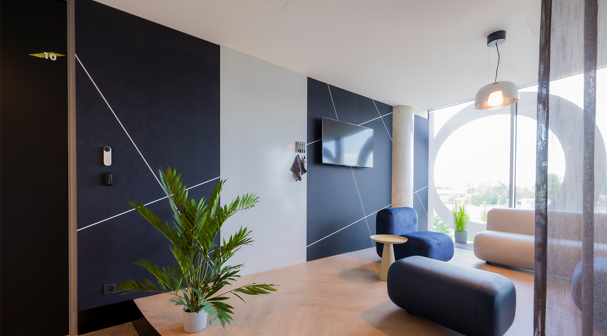 Deze multifunctionele wand is geïnstalleerd in een gemeenschappelijke ruimte bij Corda Campus in Hasselt. 25 mm PET-vilt panelen, bedrukt in grijs en voorzien van v-cuts, omsluiten een frameloos whiteboard paneel dat gelijk ligt aan het PET-vilt. Dit whiteboard paneel is aan de achterzijde uitgevuld om het verschil in dikte (25 mm PET-vilt tegenover 10 mm whiteboard) te overbruggen.