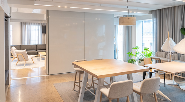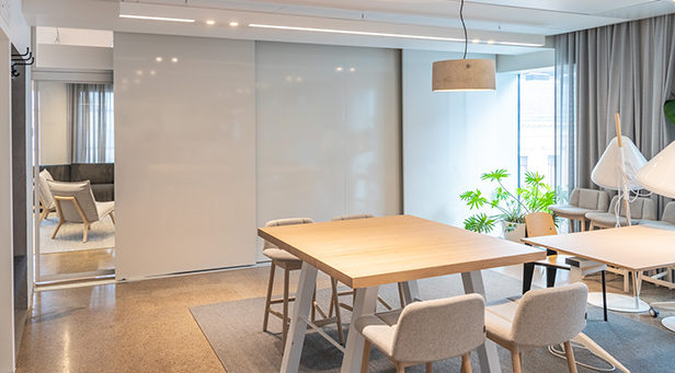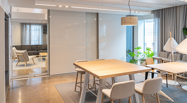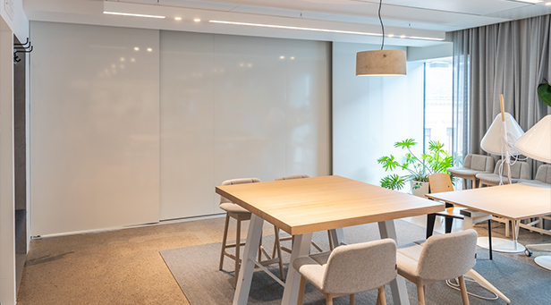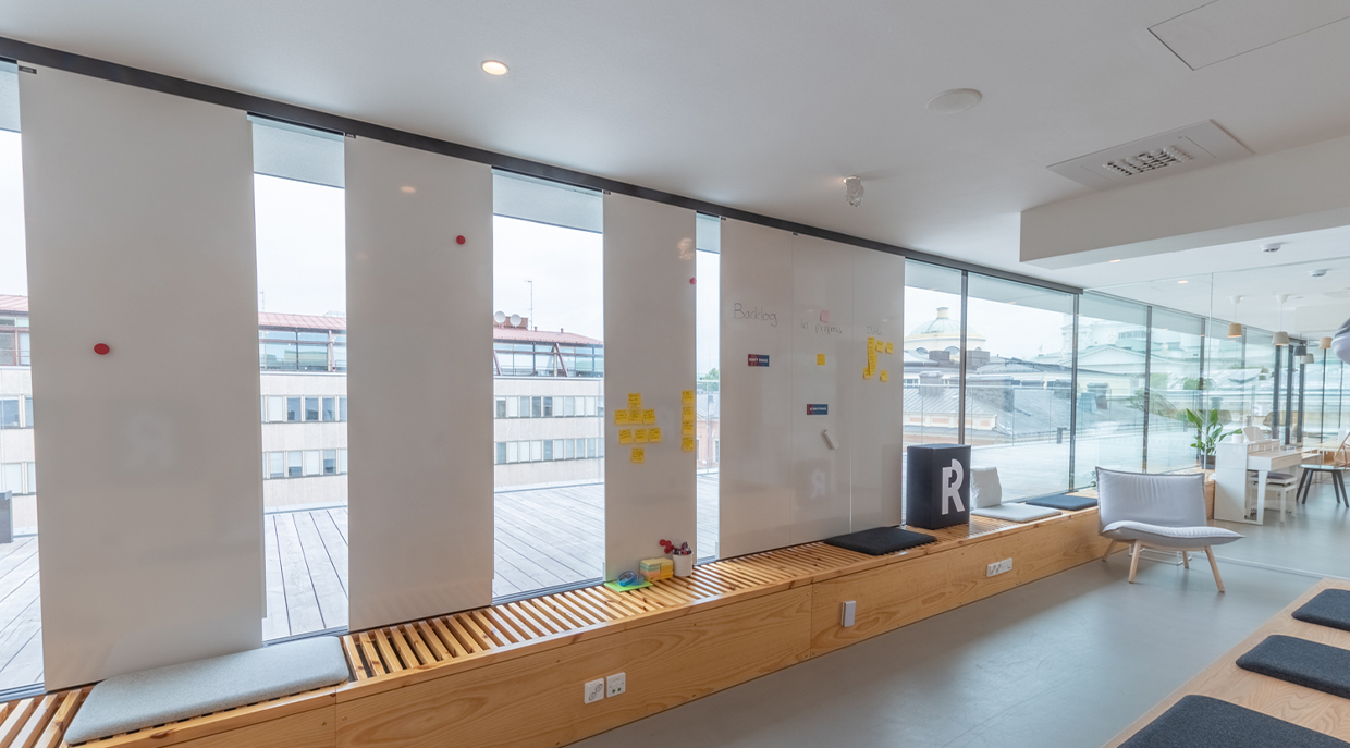 Voor dit project zijn grote whiteboard panelen geïntegreerd in diverse schuifdeursystemen. Het schuifsysteem is enerzijds voor raampartijen geplaatst als beschrijfbare vitrage. Anderzijds zijn de railsystemen in de ruimte geplaatst om een flexibele scheiding in de ruimte aan te brengen.