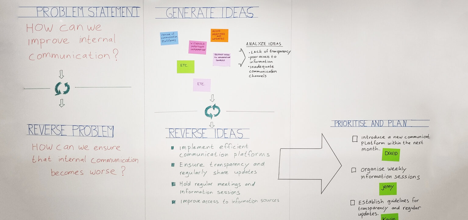 Reverse Brainstorming is een unieke brainstorm techniek die denkt vanuit problemen in plaats van oplossingen. Dat klinkt weinig doelgericht, maar het tegenovergestelde is waar.